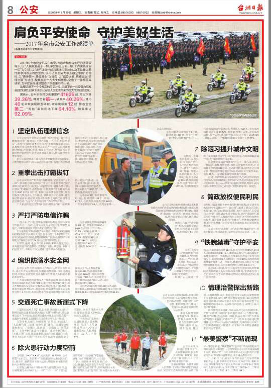 2017年,全市公安机关在市委、市政府和省公安厅的坚强领导下,以“人民利益高于一切、平安稳定压倒一切、工作实绩说明一切”为引领,以“决不让台州成为违法犯罪洼地,决不让重大恶性案事件夺走百姓生命,决不让黑恶势力带走群众幸福”为目标,以“勇争第一、勇立潮头”为导向,以“强势治安、精细治业、情理治警”为途径,聚焦党的十九大安保,全面抓好维护稳定、严打严管、护佑民生、深化改革、建强队伍工作,各项工作取得前所未有的好成绩,交出一张靓丽成绩单,为平安台州建设增添了浓墨重彩的一笔。