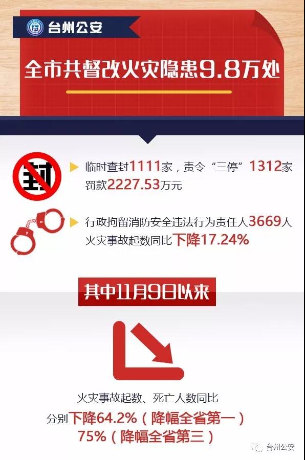 挖根断源,有效消除火灾隐患。全市公安机关以居住出租房(合用场所)、高层建筑、人员密集场所、电动车为排查整治重点,以居住出租房(合用场所)、高层建筑、人员密集场所、电动车为排查整治重点,出台硬隔离技术标准和“七个一律”、“三个一律”、《居住出租房管理“十项铁规”》等刚性措施,全市停建通天房。出台《台州市火灾隐患举报奖励暂行办法》,鼓励和引导人民群众积极举报身边的火灾隐患,通过社会监督进一步督促有关部门依法履行消防安全管理职责。开展村级防火夜巡打更、居住出租房屋和企业值守活动,打造消防工作共建共治共享的社会治理格局。