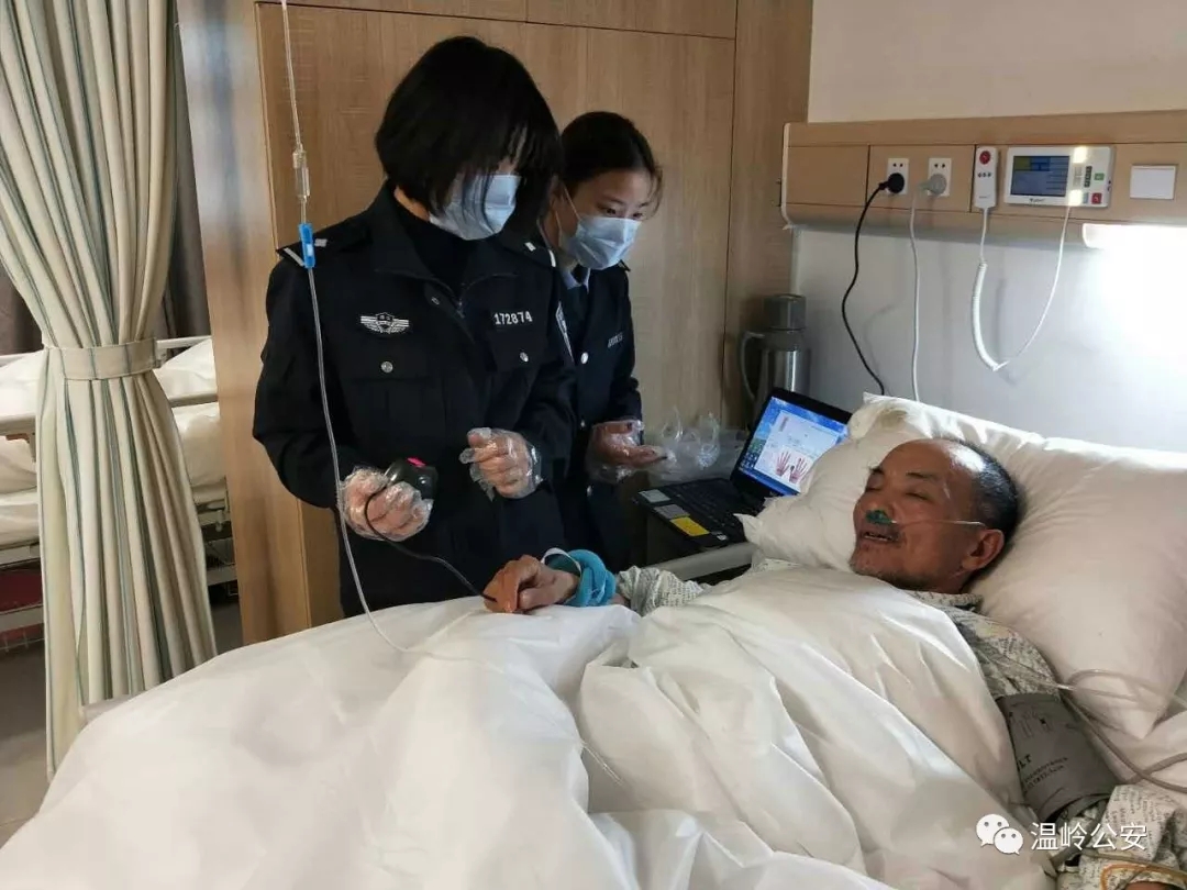叶大爷身上插了好几根管子,说话费力,所幸思维清晰,见到民警的到来,他脸上一直挂着笑容。“大爷,我们帮您稍微挪一下身子……头再偏右一点……您在这里按一下指纹……好了!”不一会儿,工作人员又提着各项设备与叶大爷道别,轻手轻脚地离开医院。